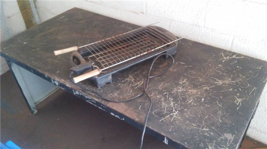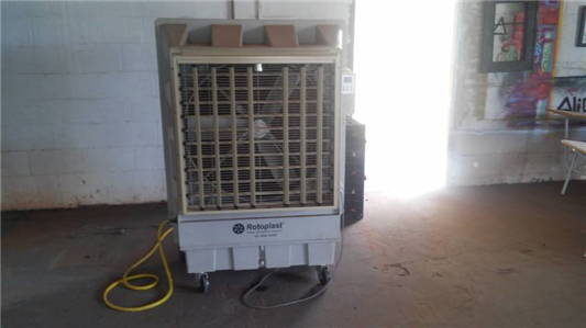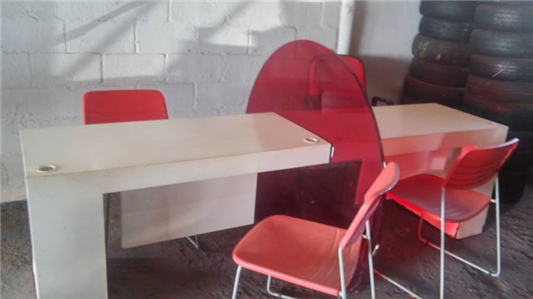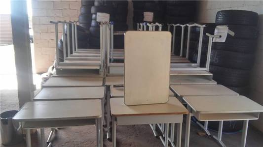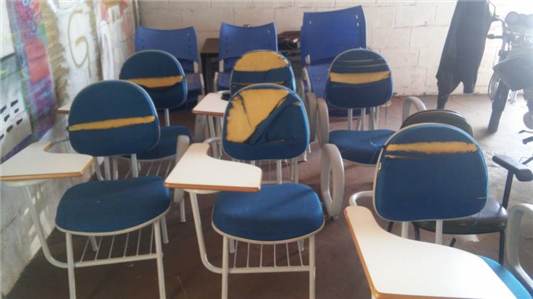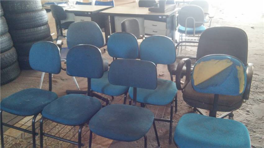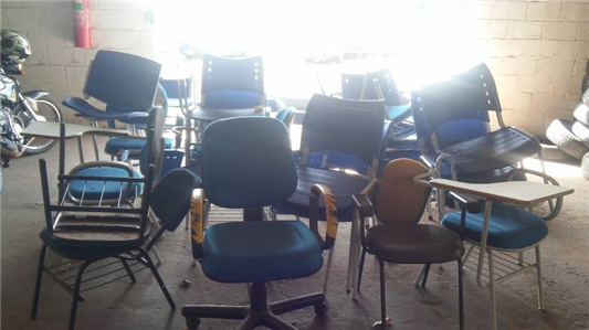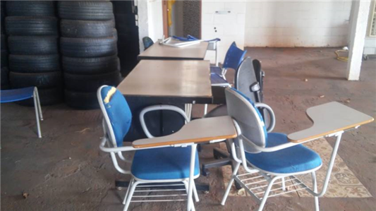 Leilã de itens diversos: cadeiras, mesas, carteiras escolares, climatizador, entre outros itens selecionados.
