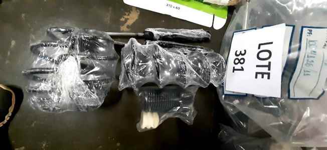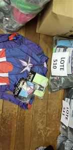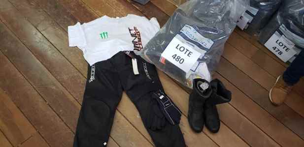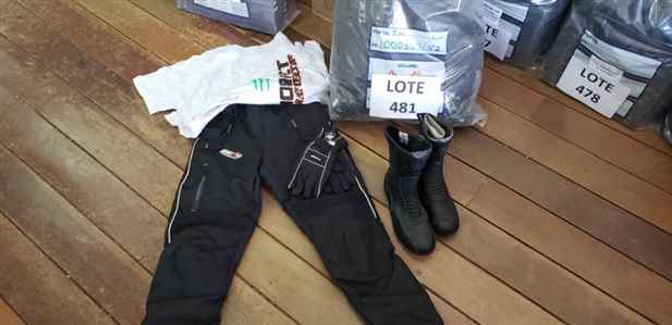 Lote 0481 - 39 UNID ARTIGOS PARA MOTOCICLISTAS: 05 CAMISETAS, 03 CALÇAS, 12 PARES BOTAS, 16 LUVAS E 03 TOUCAS DE LÃ. OBS: ALGUMAS BOTAS COM DEFEITOS / AVARIAS.